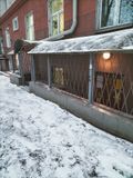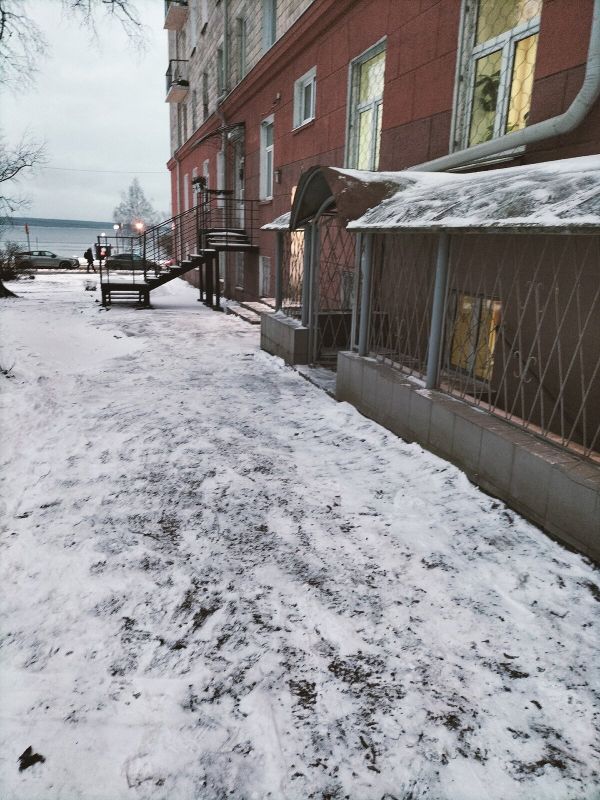Уборка территории у входа в помещение спортивной школы.
